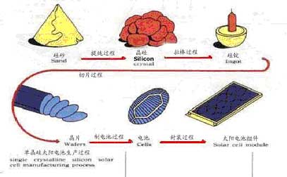 当光线照射太阳电池表面时,一部分光子被硅材料吸收;光子的能量传递给了硅原子,使电子发生了越迁,成为自由电子在P-N结两侧集聚形成了电位差,当外部接通电路时,在该电压的作用下,将会有电流流过外部电路产生一定的输出功率。这个过程的的实质是:光子能量转换成电能的过程。 晶体硅太阳电池的制作过程:“硅”是我们这个星球上储藏最丰富的材料之一。自从上个世纪科学家们发现了晶体硅的半导体特性后,它几乎改变了一切,甚至人类的思维,20世纪末,我们的生活中处处可见“硅”的身影和作用,晶体硅太阳电池是近15年来形成产业化最快的。生产过程大致可分为五个步骤:a)提纯过程 b)拉棒过程 c)切片过程 d)制电池过程 e)封装过程。如下图所示: | | |