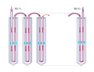 为满足集热器的设计要求,选取了浙江正兴能源科技有限公司的自主知识产权产品:连续变向串流管全玻璃真空管太阳能集热器。图2表示太阳能集热器模块方式,图3为U型串流管端部结构图。