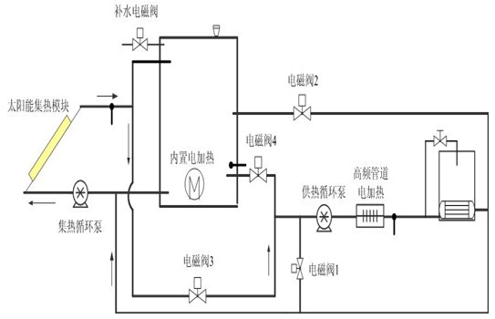 (4)直接供热系统:由集热循环泵、太阳能集热器、电磁阀3、供热循环泵、高频管道加热器、板式换热器之间构成一个太阳能集热直接供给末端用热的系统;