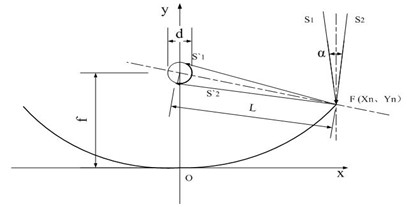 设计槽式抛物面聚光集热器,在确定光热转换元件以及反射镜后,聚光比、抛物线焦距是两个重要的设计参数。 由于所选取的CPS内管为圆柱形,经过反射后的太阳能光线都聚集在圆柱的外表面,我们称为“柱式受光”。也就是圆管直径恰为放射镜面边缘光形成的太阳能像直径,图6表示槽式抛物面的截平面型线与光路图。