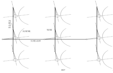 大面积使用聚光型中高温集热器,扩大太阳能集热系统的收益量,尽量满足热负荷的需求,是本方案解决的重点。在选取单槽光跟踪方式后,设计采用如图8所示的联动式阵列。它由多个独立的聚光槽通过列连杆、铰链组成一列;多个列通过行连杆、铰链联动后,组成阵列。其特点是使用一套光跟踪动力装置,可以带动多个聚光槽同时、同程、同向跟踪太阳光。图9 为本实施例的实际试验阵列。