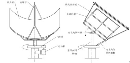 设计采用CPS管南北轴倾斜放置,聚光器绕垂直固定轴东西向回转。结构原理如图7所示。单槽光跟踪采用东西向方位180度范围自动跟踪、南北向间性手动调整光跟踪。其特点是具有较高的太阳能单位面积收益量。