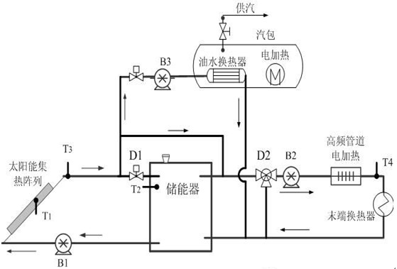 如图中所示,集热器温度T1大于储能器温度T2,且温差为15°C时循环泵B1启动;电磁阀D1打开,对储能器实施加热。当太阳能集热供出温度大于270°C时,这时有可能储能器温度高于270°C,或者低于270°C,但温差小于15°C;如果末端用热,电磁阀D1关闭,太阳能直接向负荷供热。