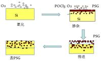 POCl3 液态分子在N2 载气的携带下进入炉管,在高温下经过一系列化学反应磷原子被置换,并扩散进入硅片表面,激活形成N型掺杂,与P型衬底形成PN结。主要的化学反应式如下: